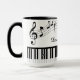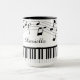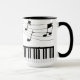 Modern, personalised music coffee mug featuring a piano keyboard and music notes with a name, monogram or custom text in your choice of colours and font styles (shown in black and white). Ideal for music teachers, musicians and music professionals. The sample is shown in the 15 oz. size mug with coloured handle and inside--other mug sizes, styles and colours are available on the ordering page or you can transfer the design to another product. ASSISTANCE: For help with design modification or personalisation, colour change, resizing or transferring the design to another product, contact the designer BEFORE ORDERING via the Zazzle Chat MESSAGE tab below or email makeitaboutyoustore@gmail.com.