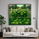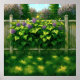 Artwork of some leaves and flowers growing on a picket fence. This vibrant artwork captures the serene beauty of a lush garden scene. A thriving hydrangea bush, bursting with clusters of delicate purple blossoms and vibrant green leaves, spills over a rustic picket fence. Sunlight dappled on the foliage and the grassy foreground creates a warm and inviting atmosphere. In the background, soft hues of blooming trees add depth and a touch of dreamy tranquillity to this picturesque scenery. This piece would bring a touch of springtime freshness and peaceful charm to any room.