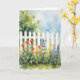 A white picket fence with flowers adorn this card. Text inside can be changed. Image is AI-generated by IveyCottage.