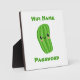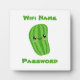 Cute pickle character with text displaying a reminder of your wifi network name and password.