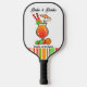 Pickleball bachelorette personalised pickleball paddle with red, green, orange, yellow pickleballs. Serve up a slice of tropical paradise with our Dinks and Drinks Pickleball Bachelorette Party invitation! Featuring a vibrant graphic of an orange coloured Hurricane Cocktail adorned with pickleballs shaped like lime slices, orange slices, and maraschino cherries, this collection is perfect for celebrating the bride-to-be's last swing before the ring or gathering your favourite pickleball pals for a smashing good time. From eye-catching invitations to matching napkins, plates, cups, and wine glasses in shades of orange, lime green, and cherry red, our collection has everything you need to make your bachelorette bash unforgettable.