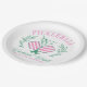 These pickleball plates have a pink and green line art image of pickleball paddles and a martini glass surrounded by laurel branches with the phrase "Pickleball Cocktail Club, Please Dink Responsibly." Colours used include green and pink.
