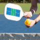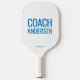 Pickleball Paddle with Court Line Diagram on one side, and large coach name in blue and white on the back is perfect for teaching students lessons and strategy and is a great way to help attendees find the coach at a busy court. All colours are editable including the both court colours and lines, you can change the font on the name and even add a logo using the Design Editor Tool.