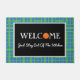 Blue and green pickleball courts in a super fun pattern with white dotted lines representing nets are the background for this pickleball-themed welcome mat. An orange pickleball replaces the O in Welcome.