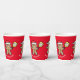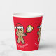 This image features a festive red paper cup with a Christmas theme. The cup has a cheerful illustration of a gingerbread man wearing a Santa hat and holding a slotted spoon. The gingerbread man is decorated with white icing for facial features and buttons. Surrounding the gingerbread man are snowflake designs, and the text “Merry Christmas” is prominently displayed in white lettering below.
