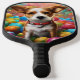 Fun terrier puppy among colourful toy balls designed by me with an AI generator to help keep your pickleball paddle safe from wear and tear outside the game.