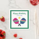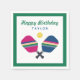 Celebrate your pickleball player or fan with these fun and vibrant party napkins featuring striped blue, green and pink pickleball paddles. Text is customisable. Happy Birthday message is also customisable. Part of a collection from Parcel Studios.