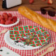 Santa Claus and reindeer love playing pickleball. The background is our fun red, green and white pickleballs as Christmas tree ornaments. Fun pickleball-themed Christmas decorations, gifts, party supplies for yourself, your pickleball-loving friend, mom, dad, uncle, aunt, brother, sister, neighbor, grandpa, grandma, or work buddy who won't stop talking about pickleball.