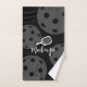 Personalised Pickleball Hand Towel for Sweat printed with custom name or text in a fun and funky feminine script font with a simple pickleball paddle monogram and pickleball ball background in black and white and grey, a great gift, party favour, or as matching team gear. Use Zazzle's customisation options to create a towel in any colour or design with the pickleball artwork elements and font options with custom text and wording.