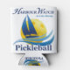 The Harbour Watch pickleball rec league plays on lovely Lake Murray where players will often go for a sail and then meet up and play pickleball. In this design, a blue sailboat glides through waves with a yellow pickleball sun in the background.