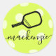 Personalised Pickleball ball stickers printed with custom name or text in a feminine girly and modern pretty script font and simple pickleball paddle monogram, great for a tennis birthday invitation, favour, or gift. Use Zazzle's customisation options to create one sheet for each guest as a take-away favour from a pickleball club birthday party.