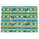 Pickleball paddles & orange balls are waiting to play on a green court adorned with greens, blues, white and orange stripes, and diamonds.