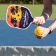 A super fun pickleball paddle featuring a "pickleball sun" surrounded by a palm tree and blue ocean waves. Add 3 lines of custom text - club name, location, player's name, phone number, etc. Or delete and just have the graphic. Makes a perfect gift for all pickleball players - dads, moms, friends, kids, grandparents, pickleball partners, coaches, pickleball club members - both beginners and experienced players alike are sure to love this one of a kind paddle.
