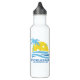 A sporty water bottle featuring a fun pickleball design of a "pickleball sun" framed by a tropical palm tree and ocean waves. Add two lines of custom text to personalise. Makes a great gift for any pickleball player, club or team organiser, teammate or instructor.