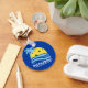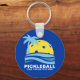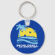 A fun pickleball keychain featuring a pickleball "sun" framed by a tropical palm tree and blue ocean waves. Add your custom text below - club name, pickleball weekend date/location, tournament name, player names, etc. Hang from your pickleball bag or use for car keys - Makes a perfect gift for any pickleball player. Easily change the background color.