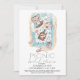 This cute "picnic at the beach" bridal shower invitation features a white background with a picnic basket filled with fruit and bread, a piece of pizza, and a charcuterie board with cheese and meat. The reverse side features a white background with geometric patterns in indigo blue. Personalise it for your needs. You can find matching products at my store.