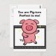 A cute doodle of a pink pig posing happily with sparkles surrounding it and it is so perfect that it is popping up of the camera film border. Caption reads "You are Pig-ture Perfect to me!" which is a play on the term "Picture Perfect". A funny and wacky cartoon to tease and put a smile on the recipient's face. Design by Rusty Doodle.