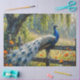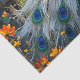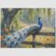 beautiful piebald peacock standing on a split rail fence in wildflowers