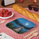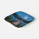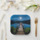 Paper plates with a beautiful photograph of a wooden pier stretching out over a calm lake.