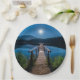 Paper plates with a beautiful photograph of a wooden pier stretching out over a calm lake.