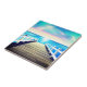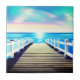 Ceramic tile in an illustration of a pier, fenced in white, extending towards an aquamarine sea, under a pink tinged dawn sky
