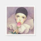 Package of 50 white paper cocktail napkins with a vintage image of the sad clown Pierrot with a tear in her eye and a long-stemmed pink rose in her hand. Pierrot is a character that has evolved in appearance with Romantic, Decadent, Symbolist, and early Modernist Theatre and art. This image is the popular image of Pierrot in the 1980s. See matching cloth napkin, kitchen towel, cloth placemat, paper placemat and coasters. See the entire Tubular 80s Napkin collection in the FOOD/BEV | Linens section.