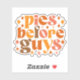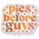 This fun and cheeky fall-themed design features the playful phrase "Pies Before Guys" in a bold, retro-inspired font. The text is arranged in a compact, stacked layout with each word in a different font style, creating a dynamic and eye-catching composition. The colour palette includes warm autumnal hues like deep oranges, rich browns, and golden yellows, perfectly capturing the cosy vibes of the season.
