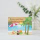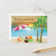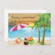 Calm tropical beach scene with umbrella shading a cute pig sleeping on an inner tube. He has a coconut drink sitting beside him and palm trees to the right. Any text is easy to eliminate or change