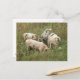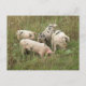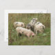 This cute postcard features a beautiful photograph of a group of cute pigs in a field. Some of the pigs are rooting around in the earth while others look on.