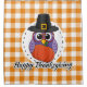 Pilgrim owl on an orange white buffalo plaid pattern background with caption "Happy Thanksgiving".