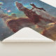 A space photo from NASA Hubble featuring the "Pillars of Creation" within the Eagle Nebula, or M16 on the large size Sherpa blanket. This image is dominated by shades of brown and teal blue with some green and orange. You can change the crop setting on this large blanket if you'd like to see more of the sparking "star". Here is a quote about why the different colours show up... "The colours in the image highlight emission from several chemical elements. Oxygen emission is blue, sulphur is orange, and hydrogen and nitrogen are green."