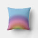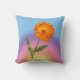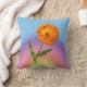Orange Calendula flower on a stem is showcased in front of a rainbow patterned background. Dew or rain drops adorn the flower's petals. Reverse of pillow shows rainbow only.