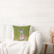 Rabbit holding an orange carrot is standing in a field of green grass. Background grass is replicated on back of pillow.