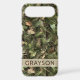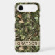 Customize this pine and leaves camouflage iPhone 17 air case with your name in a trendy modern CAP font in brown on opaque cream. It's masculine and perfect for your favorite military, hunting, country or outdoorsman!