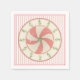 These paper napkins feature a delightful original design start w/a pink & white stripped background where a floating wreath of zig-zagging Christmas trees surrounding a central medallion of a classic pinwheel style peppermint candy. It has a 1940-1950s retro feel due to faded shades of red and green & 'grunged' effect.