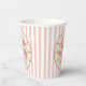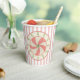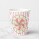 These paper cups feature a delightful original design start w/a pink & white stripped background where a floating wreath of zig-zagging Christmas trees surrounding a central medallion of a classic pinwheel style peppermint candy. It has a 1940-1950s retro feel due to faded shades of red and green & 'grunged' effect.