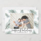 A modern and elegant holiday card design featuring your favourite landscape orientated or horizontal photo surrounded by spruce green watercolor pine boughs and Christmas greenery. "Happiest Holidays" appears beneath in handwritten lettering. Personalise with your family name along the bottom.