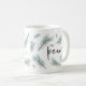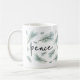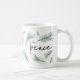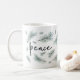 Modern and festive holiday mug design features "peace" in chic handwritten lettering, surrounded by watercolor pine bough illustrations in spruce green.