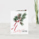 A watercolor-painted pine tree branch with Christmas red berries and a thin red ribbon on a pure white background makes for an elegant and minimalist holiday card. All writing is editable.