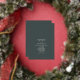 Illustration of foil pine cone with foil line border and off white text over dark emerald background.