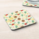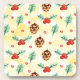 Coaster with a cute Christmas pattern featuring pine cones and holly on a yellow watercolor background with little white circles scattered around.