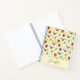 Spiral notebook with a cute pattern featuring pine cones and holly on a yellow watercolor background with little white circles scattered around.