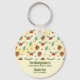 Christmas party (or other event) thank you favour key chain with a cute pattern featuring pine cones and holly on a yellow watercolor background with little white circles scattered around.