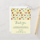 Thank you postcard with a cute pattern featuring pine cones and holly on a yellow watercolor background with little white circles scattered around.