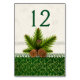 Elegant flat style wedding reception table number card done in a winter theme, with antique ivory background with graphics of lace ribbon, pine sprig with pine cones and a gold on green design, across the bottom. Custom green table number is ready to personalise for each table at your reception. Matching wedding products are available.