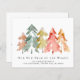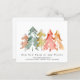 Budget-friendly simple and elegant moving announcement featuring a beautiful watercolor forest of abstract pine trees in muted green, red, gold and orange. On the front, personalise the "Our New Neck of the Woods" text, your family name and your new address. On the reverse side you can personalise your announcement in more detail and include telephone numbers and email addresses if desired.