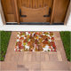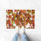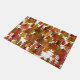 Subtly shadowed layers of pine tree cutouts in greens, reds, oranges, and browns on a white background