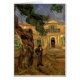 Pine Trees with Figure in the Garden of Saint-Paul Hospital by Vincent van Gogh is a vintage fine art post impressionism daily life portrait painting featuring a view of a man standing beneath pine trees in the gardens with a building with shutters and a balcony in the background. Another person is standing at the front door, the main entrance to the hospital.