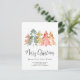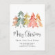 Elegant holiday moving announcement postcard featuring a watercolor abstract of pine trees in muted green, red, gold and orange, "Merry Christmas" in a stylish script and your name and new address. On the reverse side, personalise your moving announcement and Christmas greeting, and include telephone numbers and email addresses if desired.