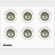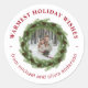Affordable custom printed holiday photo stickers with a simple template for customisation. This modern design features a wreath of green pine branches and pine cones framing your photo on a round shaped sticker. Use the design tools to customise the fonts and colours or upload more photos to create your own Christmas photo label.